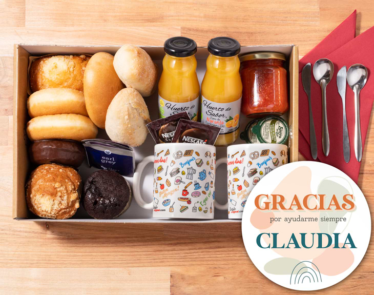 Contenido para 1 persona: • Caja (personalizada o sin personalizar). • Taza blanca (personalízala por 5€). • Manzana roja. • Café. • Té de varios sabores. • Zumo ecológico (Huerto de Sabor). • Bollería Artesanal: -Coulant de chocolate (artesanal). -Muffins con pepitas. (artesanal). -Donuts. -Mini Donuts. • Servilleta. • Tarjeta Recordatoria. Contenido para 2 personas: • Caja (personalizada o sin personalizar). • 2 Tazas blancas (personaliza cada una por 5€). • 2 Cafés. • Té de varios sabores. • 2 Zumos ecológico (Huerto de Sabor). • Bollería Artesanal: -Coulant de chocolate (artesanal). -Muffins con pepitas. (artesanal). -Donuts. -Mini Donuts. • Panes artesanales: - Pan chapata - Pan de cristal. - Pan brioche. • Tomate rosa de Barbastro triturado (300g). • 2 Aceites de oliva ecológicos 10 ml. • 2 cuberterías. • 2 servilletas. • Tarjeta Recordatoria. Las tazas y los termos personalizados reemplazarán a los del desayuno. ¿Cómo incluir los productos opcionales? Una vez hayas seleccionado el tipo de desayuno, en el apartado de adicionales (paso 2) podrás añadir todos los productos opcionales que quieras.