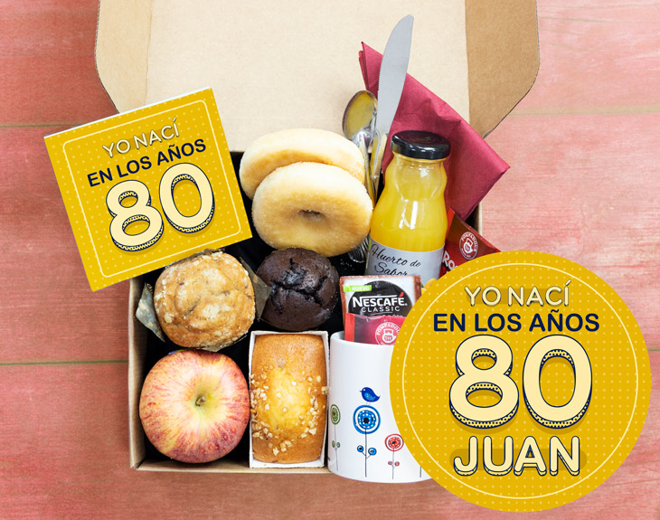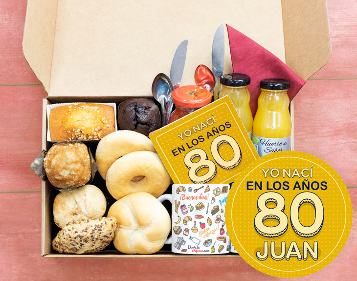 Contenido para 1 persona: • Caja (personalizada o sin personalizar). • Taza blanca (personalízala por 5€). • Manzana roja. • Café. • Té de varios sabores. • Zumo ecológico. • Bollería Artesanal: -Coulant de chocolate (artesanal). -Muffins con pepitas. (artesanal). -Donuts. -Mini Donuts. • Libro "Yo nací en los años 80" (52 páginas). • Servilleta. • Tarjeta Recordatoria. Contenido para 2 personas: • Caja (personalizada o sin personalizar). • 2 Tazas blancas (personaliza cada una por 5€). • 2 Cafés. • Té de varios sabores. • 2 Zumos ecológico (Huerto de Sabor). • Bollería Artesanal: -Coulant de chocolate (artesanal). -Muffins con pepitas. (artesanal). -Donuts. -Mini Donuts. • Panes artesanales: - Pan chapata - Pan de cristal. - Pan brioche. • Tomate rosa de Barbastro triturado (300g). • 2 Aceites de oliva ecológicos 10 ml. • 2 cuberterías. • 2 servilletas. • Libro "Yo nací en los años 80" (52 páginas). • Tarjeta Recordatoria. Las tazas y los termos personalizados reemplazarán a los del desayuno. ¿Cómo incluir los productos opcionales? Una vez hayas seleccionado el tipo de desayuno, en el apartado de adicionales (paso 2) podrás añadir todos los productos opcionales que quieras.