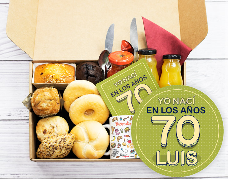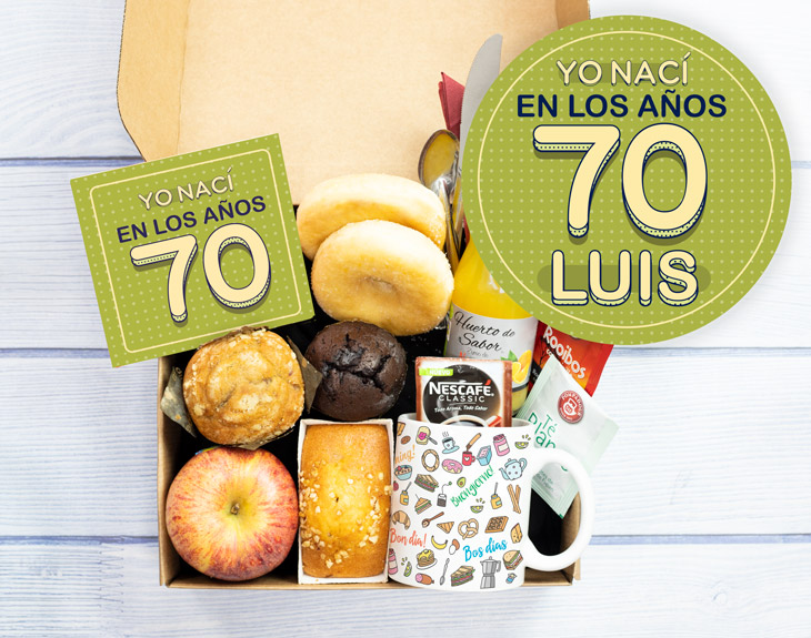 Contenido para 1 persona: • Caja (personalizada o sin personalizar). • Taza blanca (personalízala por 5€). • Manzana roja. • Café. • Té de varios sabores. • Zumo ecológico. • Bollería Artesanal: -Coulant de chocolate (artesanal). -Muffins con pepitas. (artesanal). -Donuts. -Mini Donuts. • Libro "Yo nací en los años 70" (52 páginas). • Servilleta. • Tarjeta Recordatoria. Contenido para 2 personas: • Caja (personalizada o sin personalizar). • 2 Tazas blancas (personaliza cada una por 5€). • 2 Cafés. • Té de varios sabores. • 2 Zumos ecológico (Huerto de Sabor). • Bollería Artesanal: -Coulant de chocolate (artesanal). -Muffins con pepitas. (artesanal). -Donuts. -Mini Donuts. • Panes artesanales: - Pan chapata - Pan de cristal. - Pan brioche. • Tomate rosa de Barbastro triturado (300g). • 2 Aceites de oliva ecológicos 10 ml. • 2 cuberterías. • 2 servilletas. • Libro "Yo nací en los años 70" (52 páginas). • Tarjeta Recordatoria. Las tazas y los termos personalizados reemplazarán a los del desayuno. ¿Cómo incluir los productos opcionales? Una vez hayas seleccionado el tipo de desayuno, en el apartado de adicionales (paso 2) podrás añadir todos los productos opcionales que quieras.