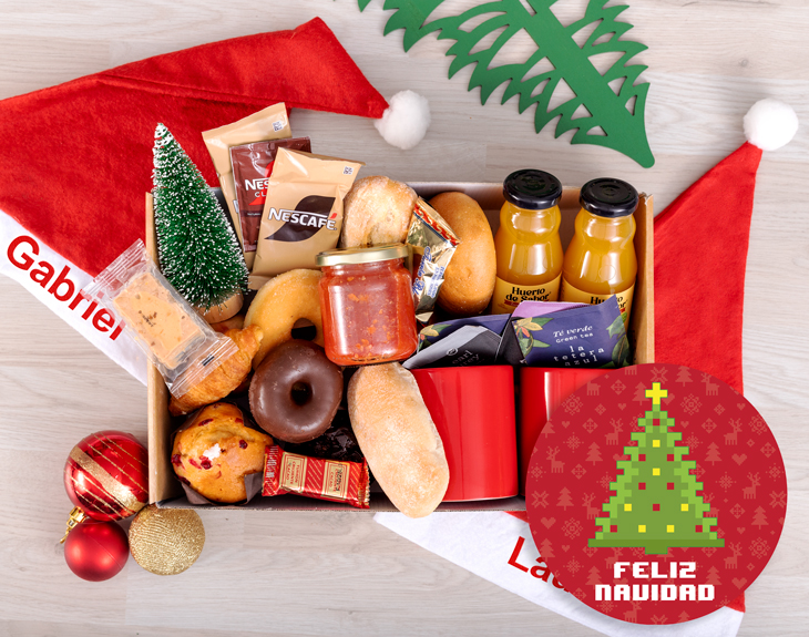 Contenido para 1 persona: • Caja. • Árbol de navidad. • Gorro navideño (personalización opcional). • Turroncito de almendra • Turroncito de almendra con cacao. • Porción de turrón blando. • Taza roja. • Café. • Té de varios sabores. • Rooibos. • Zumo ecológico (Huerto de Sabor). • Bollería Artesanal: -Coulant de chocolate (artesanal). -Muffins con pepitas. (artesanal). -Donuts (Pan Rico). -Pump cake (artesanal) -Mini Donuts (Pan Rico). • Servilleta. • Tarjeta Recordatoria. Contenido para 2 personas: • Caja. • Árbol de navidad. • 2 Gorros navideños (personalización opcional). • 2 Turroncitos de almendra • 2 Turroncitos de almendra con cacao. • 2 Porciones de turrón blando. • 2 Tazas rojas. • 2 Cafés. • Té de varios sabores. • 2 Rooibos. • 2 Zumos ecológico (Huerto de Sabor). • Bollería Artesanal: -Coulant de chocolate (artesanal). -Muffins con pepitas. (artesanal). -Donuts (Pan Rico). -Pump cake (artesanal) -Mini Donuts (Pan Rico). • Panes artesanales: - Pan chapata - Pan de cristal. - Pan brioche. • Tomate rosa de Barbastro triturado (300g). • 2 Aceites de oliva ecológicos 10 ml. • 2 cuberterías. • 2 servilletas. • Tarjeta Recordatoria. Las tazas y los termos personalizados reemplazarán a los del desayuno.