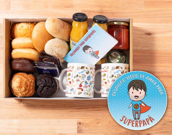 Contenido para 1 persona: • Caja. • Taza blanca (personalízala por 5€). • Manzana roja (opcional). • Café. • Té de varios sabores. • Zumo ecológico. • Bollería Artesanal: -Coulant de chocolate (artesanal). -Muffins con pepitas. (artesanal). -Donuts. -Mini Donuts. • Talonario con vales para súper papás. • Servilleta. • Tarjeta Recordatoria. Contenido para 2 personas: • Caja (personalizada o sin personalizar). • 2 Tazas blancas (personaliza cada una por 5€). • 2 Cafés. • Té de varios sabores. • 2 Zumos ecológico (Huerto de Sabor). • Bollería Artesanal: -Coulant de chocolate (artesanal). -Muffins con pepitas. (artesanal). -Donuts. -Mini Donuts. • Panes artesanales: - Pan chapata - Pan de cristal. - Pan brioche. • Tomate rosa de Barbastro triturado (300g). • 2 Aceites de oliva ecológicos 10 ml. • 2 cuberterías. • 2 servilletas. • Talonario con vales para súper papás. • Tarjeta Recordatoria. Las tazas y los termos personalizados reemplazarán a los del desayuno. ¿Cómo incluir los productos opcionales? Una vez hayas seleccionado el tipo de desayuno, en el apartado de adicionales (paso 2) podrás añadir todos los productos opcionales que quieras.