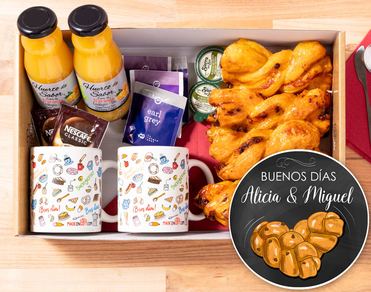Contenido para 1 persona: • Caja (personalizada o sin personalizar). • Taza blanca (personalízala por 5€). • Manzana roja. • Café. • Té de varios sabores. • Zumo ecológico. • Cuatro trenzas "Baby" calidad artesanal 75g. • Servilleta. • Tarjeta Recordatoria. Contenido para 2 personas: • Caja (personalizada o sin personalizar). • 2 Tazas blancas (personaliza cada una por 5€). • 2 Cafés. • Té de varios sabores. • 2 Zumos ecológico (Huerto de Sabor). • Cuatro trenzas "Baby" calidad artesanal 75g. • 2 Aceites de oliva ecológicos 10 ml. • 2 cuberterías. • 2 servilletas. • Tarjeta Recordatoria. Las tazas y los termos personalizados reemplazarán a los del desayuno. ¿Cómo incluir los productos opcionales? Una vez hayas seleccionado el tipo de desayuno, en el apartado de adicionales (paso 2) podrás añadir todos los productos opcionales que quieras.