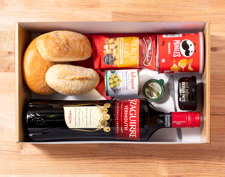 Contenido: • Caja (personalizada o sin personalizar). • Vermut • Bote de patatas Pringles. • Bote de aceitunas. • Bote de paté ibérico • Bolsa de cacahuetes • Aceite • Panes. • Cubertería. • Servilleta. • Tarjeta Recordatoria. Las tazas y los termos personalizados reemplazarán a los del desayuno. Importante: lo que ves en la foto es una sugerencia de presentación. Obviamente, por motivos sanitarios cada producto se envasa individualmente, de cara a asegurar que llega a destino en condiciones óptimas. ¿Cómo incluir los productos opcionales? Una vez hayas seleccionado el tipo de desayuno, en el apartado de adicionales (paso 2) podrás añadir todos los productos opcionales que quieras.