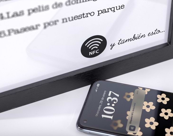• Lámina NFC personalizada. • Marco de fotos. • Tarjeta recordatoria.