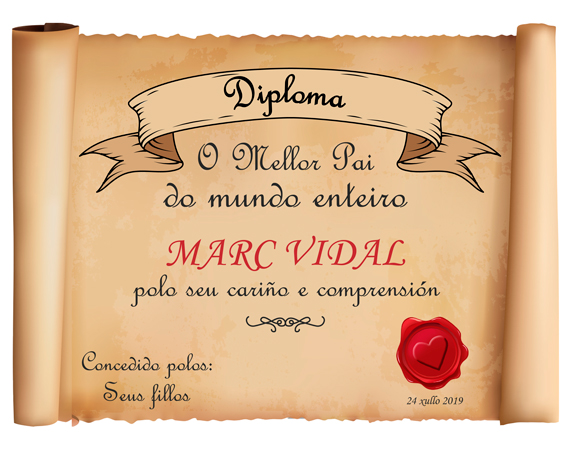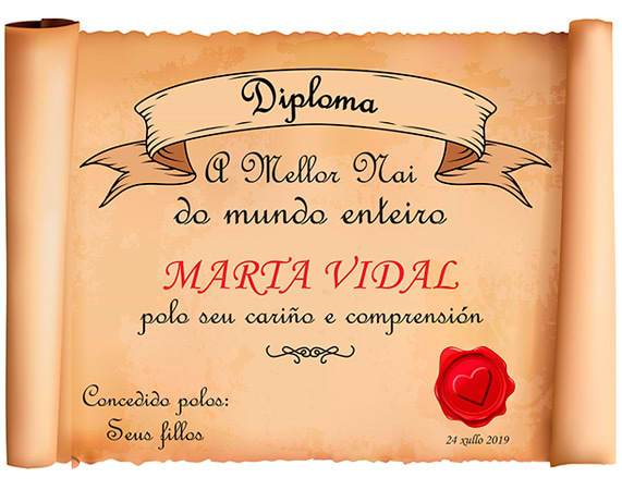 Pocas cosas hay más entrañables que regalar un diploma personalizado. Y si se trata de un diploma honorífico en galego, seguro que llegas al corazón de quien se lo merezca. Lo fabricamos en un papel que simula el pergamino, de gran calidad y gramaje. Por supuesto, ponemos todo lo que tú nos digas: nombre de la persona, una frase especial, nombre de quien hace el regalo y la fecha del mismo. ¡Un recuerdo para toda la vida! Además, tienes la opción de adquirir el diploma enmarcado. Importante: El color del marco puede variar según stock.