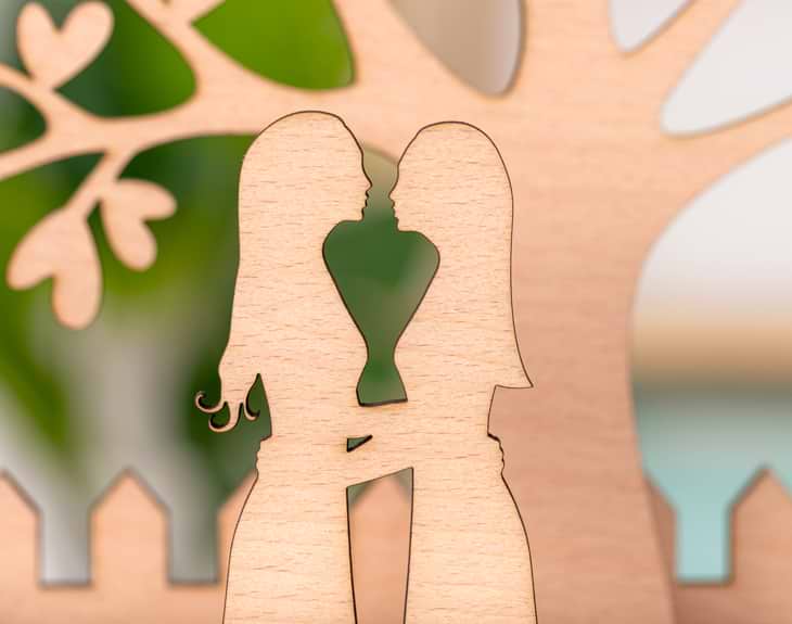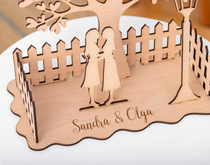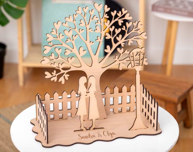 Seguro que uno de vuestros planes favoritos es ver una película romántica acurrucadas en el sofá, con manta y un buen té o vuestra bebida favorita. Desde luego no hay nada mejor después de un día duro de trabajo que compartir momentos bonitos con tu media naranja. Si soñáis con convertiros en personajes principales de una película de amor esta escena de madera es perfecta para que os sumerjáis completamente en esa narrativa. Esta escena se recorta con láser pieza por pieza en una madera de excelente calidad, también se graban vuestros nombres debajo para que sea lo más personalizable posible. La pieza más grande (el árbol) tiene un tamaño de 32 x 29 cm con una base de 34 x 18 cm, siendo una pieza muy vistosa y elegante que destacará en la decoración de tu casa y será un regalo perfecto para San Valentín. Hay un montón de películas que pueden recordarte a esta escena: desde películas animadas como "101 dálmatas" a grandes clásicos como "El diario de Noah" o "Juno". Seguro que alguna se te viene a la mente. Con esta vistosa escena les harás preguntarse a tus visitas en qué película fue inspirada y destacará entre el resto de tus decoraciones. Es el regalo original perfecto para San Valentín o vuestro aniversario.