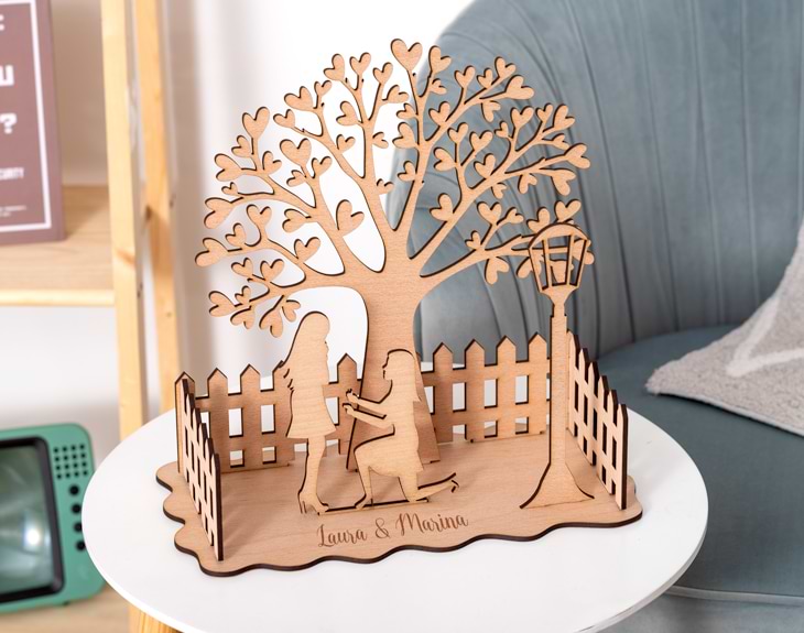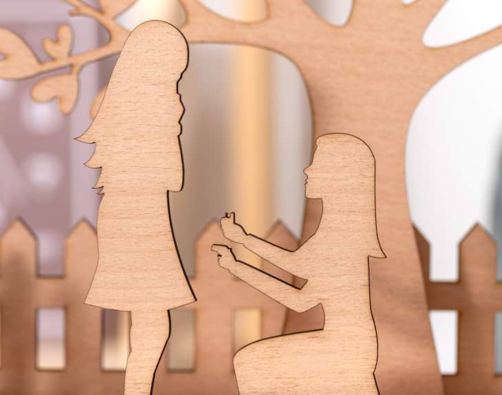 ¿Tu sueño es pedirle la mano a tu pareja en una romántica escena que parezca recién sacada de Hollywood? Hay un montón de películas románticas en las que se pide matrimonio en un lugar precioso, arrodillándose ante el amor de su vida y dedicando unas bonitas palabras de amor. Ya sea el caso de que quieras representar este idílico momento o acompañar tu pedida de mano de una manera única y original esta escena de madera es perfecta para darle una sorpresa a tu novia. Nuestra escena se realiza 100% artesanalmente, de una pieza grande de madera de exquisita calidad se van recortando las piezas más pequeñas una a una con láser, a continuación se lijan, se hacen las ranuras para montar la escena y se comprueba que encajen a la perfección. Una vez está todo cortado y lijado se graba el texto que nos hayas pedido en la base, listo para mandar y que llegue perfectamente a su destino. Este regalo original es perfecto para cualquier momento, especialmente San Valentín, ¿qué mejor regalo hay para el día de los enamorados que una escena en la que consolidáis vuestro amor con una preciosa pedida de mano? Sea cual sea tu idea seguro que consigues hacer de ese día un recuerdo precioso que dure para toda la eternidad.