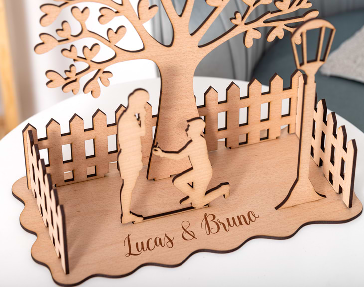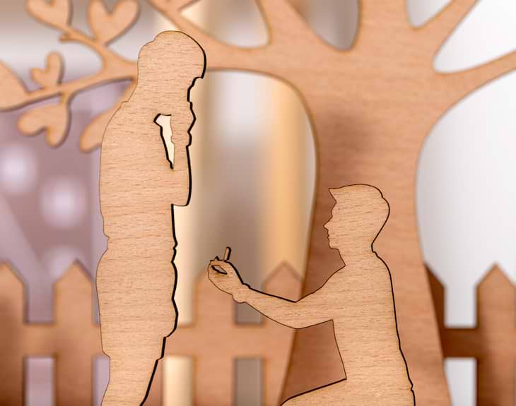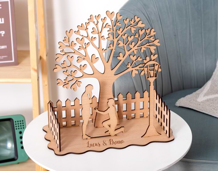 ¿Siempre has soñado con vivir un romance como el de las películas de amor del cine? Si eres un cinéfilo empedernido esta escena de madera te recordará a un montón de pelis y series de esas que te dejan huella en el corazón y te traen bonitos recuerdos. Y es que la gente que ya ha encontrado a su media naranja es una afortunada total. Si ese es tu caso sabrás que es importante cuidar los detalles y ponerle mucho mimo a vuestra relación. Nuestra escena de madera proviene de un material de excelente calidad. De un trozo más grande vamos sacando las piezas pequeñas y recortándolas con un láser de alta precisión, vamos limando y puliendo cada parte de la escena y nos aseguramos de que quepan en sus huecos correspondientes. A continuación grabamos el texto que nos hayas pedido sobre la base para así crear tu ilusión personalizada ideal. Este regalo original es perfecto para San Valentín y aniversarios. Cualquier fecha en la que sientas que quieres profesar tu amor hacia tu pareja. Es ideal como complemento a una pedida de mano o simplemente como un adelanto de vuestro futuro. Si quieres dejar a tu chico sin palabras esta escena le hará muchísima ilusión y debido a los materiales con los que se fabrica podrá guardarla para toda la vida.
