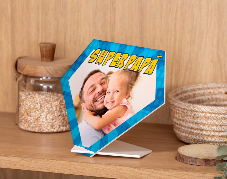 ¿Tienes la suerte de vivir con un verdadero superhéroe? Sí, ese al que todos los días llamamos papá. Y para hacerlo oficial, tenemos el regalo perfecto para él: un escudo personalizado flotante con vuestra foto favorita. ¡Es la forma más especial de reconocer su título de Super Papá! Este Día del Padre, no dejes pasar la oportunidad de demostrarle cuánto lo quieres. Con este original escudo, ¡seguro que triunfarás! Al recibirlo, será una mezcla de emoción y ternura como nunca antes. ¡Le encantará tener un detalle tan único y personal! Es un original adorno fabricado en metacrilato blanco, con un grosor de 3 milímetros, este escudo consta de dos piezas: una más grande, donde se imprimirá tu imagen, y otra más pequeña que actuará como peana para el escudo central. Al recibirlo, solo tendrás que colocar la peana en la base del escudo a la altura que desees y escoger junto a papá el rincón perfecto de tu hogar. ¿Cómo personalizarlo? Es muy fácil. Añade el producto al carrito y entra en el área de personalización. Allí escoge el diseño que prefieras y sube vuestra foto favorita. Ajusta la imagen como desees y listo. Tendrás un regalo original para papá. Tamaño escudo: 21,9 x 16,7 cm. Tamaño peana escudo: 12,9 x 10,6 cm.