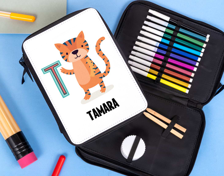 Estuche escolar personalizado, perfecto para que tu hijo o hija lleven todos sus materiales de la forma más original y divertida. Elige su inicial y esta irá acompañada de un animalito y de su nombre. El estuche incluye dos compartimentos independientes cerrados con cremalleras. Al abrirlos podrás encontrar cuatro paredes con espacios para guardar todo el material escolar. Capacidad: - 24 ranuras elásticas de 1 cm - 3 ranuras elásticas de 1 cm - 1 ranuras elásticas de 4 cm - 2 ranuras elásticas de 1, 5 cm - 3 ranuras elásticas de 4, 5 cm Medidas del estuche: 21cm x 15cm. Importante: no se incluye el contenido del estuche.