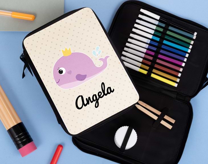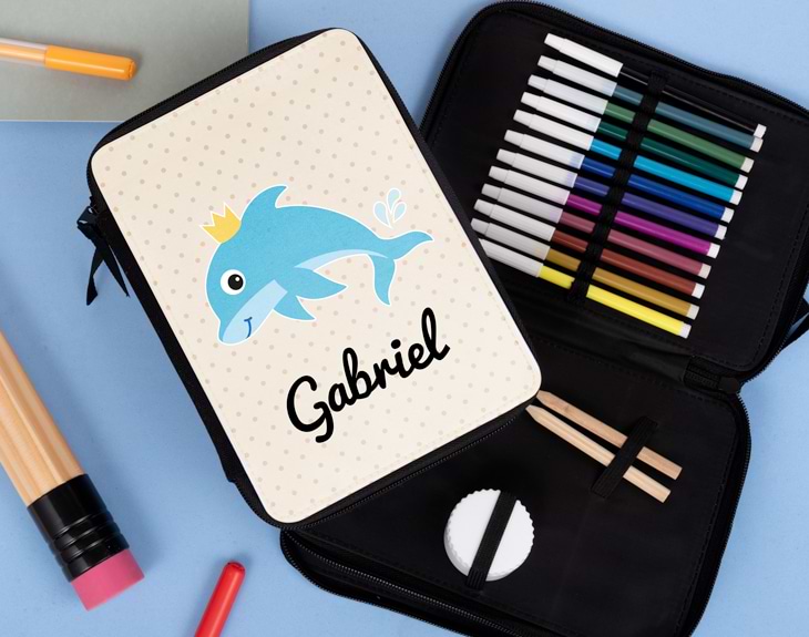 La vuelta al cole siempre suele ser un poco dura para los más peques de la casa. Que si volver a madrugar, hacer deberes y volver a estudiar para los exámenes, ir a las actividades extraescolares… Aunque también tiene sus cosas buenas como reencontrarse con esos amigos del cole o volver a las clases de los mejores profes. Pero, sin duda, lo más especial es poder estrenar estuche escolar tan chulo. ¿Quieres tener un detalle con tu hijo que comienza las clases en breves? Si le encanta el mar y sus las profundidades, este estuche es el regalo perfecto. Tiene varios estampados con animales acuáticos, puedes elegir entre un delfín, un tiburón o una ballena, el que más le guste a tu hijo. ¡Le dejará sin palabras! Estará deseando que lleguen las clases para poder presumir de estuche en clase. Aunque lo más especial de todo, es que es personalizable. Tú nos dices el nombre que tú quieras y nosotros nos encargamos de ponerlo en el estuche, justo debajo del animal acuático. ¡Le encantará! Para personalizarlo, lo primero que tienes que hacer el añadir el producto al carrito y entrar al área de personalización. En todo momento, podrás ver como el diseño en la vista previa de nuestra página web. Capacidad: - 24 ranuras elásticas de 1 cm - 3 ranuras elásticas de 1 cm - 1 ranuras elásticas de 4 cm - 2 ranuras elásticas de 1, 5 cm - 3 ranuras elásticas de 4, 5 cm Medidas del estuche: 21cm x 15cm. Importante: no se incluye el contenido del estuche.