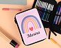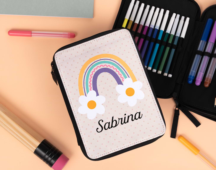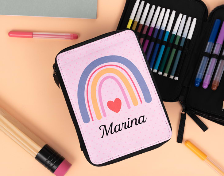 Cada día queda menos para empezar las clases de nuevo y para que empiece septiembre… ¿Ya tienes todo preparado para la vuelta al cole de tus hijos? Siempre que se acerca esta fecha, nos anticipamos para que no se nos olviden las cosas importantes. Si quieres tener un detalle con tu hijo para amenizarle un poquito su nueva rutina, este estuche escolar es el regalo perfecto. Además, tiene un estampado de un arcoíris ideal para que llene de color sus mañanas escolares. Una de las ventajas de este estuche es que tiene dos compartimentos separados, ideales para guardar todo el material escolar. Puede utilizar uno de los compartimentos para guardar las pinturillas y los rotuladores y usar el otro para los lápices, bolis y gomas. Así, lo tendrá todo bien organizado y ordenado. Además, tiene muchos apartados independientes para meter las pinturas o los rotuladores, así las podrá ver rápidamente e identificar los colores que necesite. Aunque lo más especial de todo, es que es personalizable. Tú nos dices el nombre que tú quieras y nosotros nos encargamos de ponerlo en el estuche, justo debajo del arcoíris. ¡Le encantará! Para personalizarlo, lo primero que tienes que hacer el añadir el producto al carrito y entrar al área de personalización. En todo momento, podrás ver como el diseño en la vista previa de nuestra página web. Capacidad: - 24 ranuras elásticas de 1 cm - 3 ranuras elásticas de 1 cm - 1 ranuras elásticas de 4 cm - 2 ranuras elásticas de 1, 5 cm - 3 ranuras elásticas de 4, 5 cm Medidas del estuche: 21cm x 15cm. Importante: no se incluye el contenido del estuche.