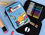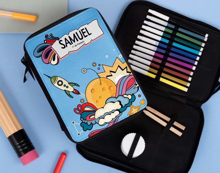 Con el objetivo de poder guardar todo el material escolar en un mismo sitio, este estuche para el cole personalizado cuenta con varios apartados para que tu hijo no vaya muy cargado al colegio. Cuenta con un diseño muy elegante para el chico más interesado en el tema del espacio, los cohetes y sus diversas conspiraciones. Puedes personalizarlo con nombre y un texto inferior (por ejemplo, especificando el curso escolar que va a estudiar tu hijo) y hacer el estuche único. El estuche incluye dos compartimentos independientes cerrados con cremalleras. Al abrirlos podrás encontrar cuatro paredes con espacios para guardar todo el material escolar. Capacidad: - 24 ranuras elásticas de 1 cm - 3 ranuras elásticas de 1 cm - 1 ranuras elásticas de 4 cm - 2 ranuras elásticas de 1, 5 cm - 3 ranuras elásticas de 4, 5 cm Medidas del estuche: 21cm x 15cm. Importante: no se incluye el contenido del estuche.