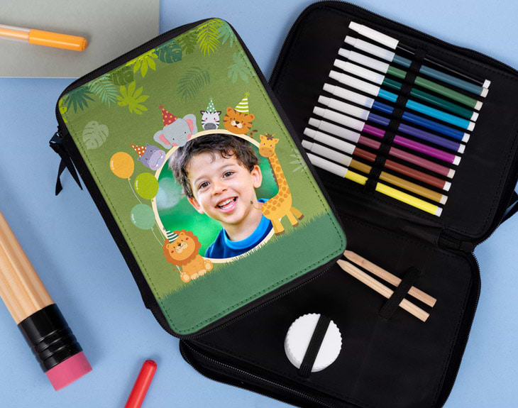 Ha llegado el momento de comenzar a preparar todo para la Vuelta al Cole. Nuevos libros, nuevas aventuras, nuevos amigos y miles de cosas por aprender. Si a tu hijo o hija le encanta estrenar material escolar, hazle una sorpresa con este estuche escolar personalizado. Además de ser súper útil y cómodo para transportar todos los lapiceros, si no hay nada que le guste más que los animales, este regalo tiene su nombre. ¡Le encantará! El estuche incluye dos compartimentos independientes cerrados con cremalleras. Al abrirlos podrás encontrar cuatro paredes con espacios para guardar todo el material escolar. Capacidad: - 24 ranuras elásticas de 1 cm - 3 ranuras elásticas de 1 cm - 1 ranuras elásticas de 4 cm - 2 ranuras elásticas de 1, 5 cm - 3 ranuras elásticas de 4, 5 cm Medidas del estuche: 21cm x 15cm. Importante: no se incluye el contenido del estuche.