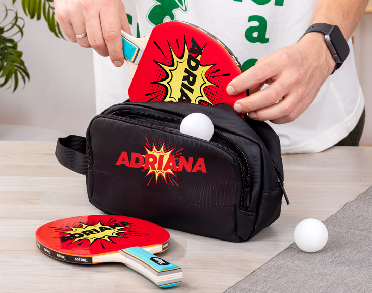 El verano es sinónimo de risas, buenos momentos en familia y recuerdos que duran para siempre. Y si hay algo que une a todos, es una partida de ping-pong. Para que esas partidas sean aún más especiales, te presentamos este estuche para palas de ping pong personalizado, perfecto para proteger y transportar tu equipo con estilo y comodidad. Este set de ping pong personalizado incluye un estuche impermeable con diseño personalizable con dos compartimentos, una pala de ping pong personalizada y tres pelotas blancas. Todo lo que necesitas para disfrutar de una buena sesión de juego y presumir de estilo en la pista. Puedes elegir entre varias opciones, según lo que necesites: estuche para una pala, para dos palas o incluso con espacio extra para las pelotas. Además, puedes personalizar cada elemento con los nombres que quieras y un diseño tipo cómic que no pasa desapercibido. Un regalo personalizado para deportistas que encantará tanto a los amantes del ping pong como a los fans de los cómics. Personalizarlo es muy fácil: añade el producto al carrito, entra en nuestro diseñador online y elige los nombres y diseños que más te gusten. ¡No te dejes ningún detalle! Nosotros nos encargamos de que quede perfecto. Importante: la opción con pelotas incluye tres unidades. Medidas del estuche: 24 × 15 × 8?cm Medida de la pala: 25?cm Color de las pelotas: surtido