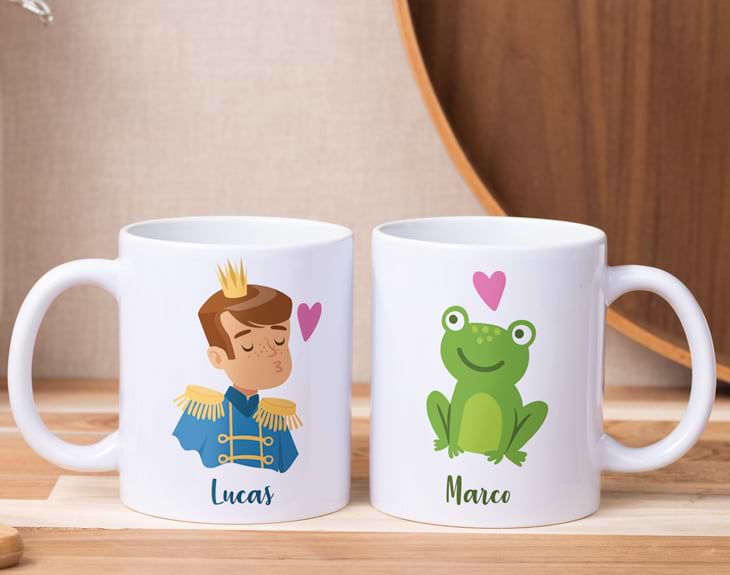 ¿Te imaginas besar a un sapo y que se convierta en tu príncipe azul? Si el amor ha aparecido en tu vida cuando menos te lo esperabas, estas tazas para parejas son perfectas para agradecer a esa personita todo lo que hace por ti. Además, si vuestra historia parece sacada de un cuento y te sientes más feliz que nunca, es el momento de demostrarle todo tu amor...¡Ahora solo queda que llenes de besos a tu príncipe favorito! Solo tienes que decirnos vuestros nombres para la personalización y se morirá de emoción e ilusión al ver este estuche tan divertido. Medidas: 26,5 cm x 25,5 cm.
