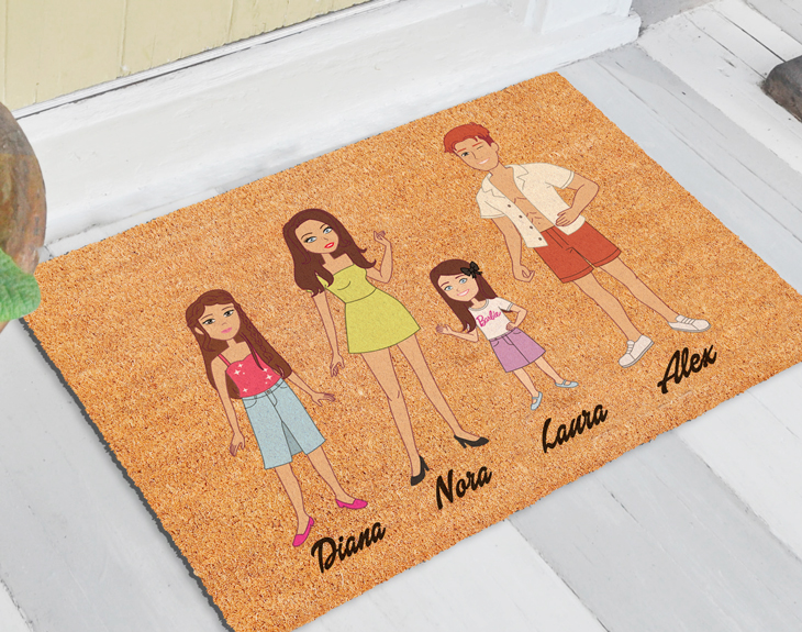 Si sois una familia que siempre tenéis visitas en casa y os encanta recibir a vuestros invitados de la mejor manera, no podrá faltar este felpudo personalizado en la entrada de vuestro hogar. Es el adorno perfecto para decorar la parte exterior de vuestra casa porque además el diseño es súper vistoso y no pasará desapercibido. ¡Seréis la auténtica familia Dollina! Si en casa sois fans de la muñeca más icónica de la historia, este felpudo será un regalo de lo más original. Sorprende a esa persona que tanto quieres en fechas tan especiales como el Día del Padre o de la Madre, un cumpleaños o el amigo invisible. ¿Siempre has querido verte como Dollina o Ken? Con este felpudo de coco podrás hacer este sueño realidad y convertir tu hogar en Dollinaland. ¡Es lo más! Llega la hora de personalizar este felpudo. Primero elige el tamaño que quieres. Después añade el producto al carrito y entra en el área de personalización. Ahí podrás dejar volar tu imaginación y comenzar a crear tus propios muñecos con todos los detalles que necesites para que sean como quien tú quieras. ¡Tendrás un montón de cosas para elegir! Será sin duda, el mejor regalo del mundo. Importante: nuestro equipo de personalización se encargará de ajustar la distribución de los personajes en el producto en función de su tamaño para que se vean lo mejor posible. Tienes que tener en cuenta que este felpudo tiene fines decorativos, no es un producto de alto tránsito. Por tanto, si lo expones a condiciones climatológicas adversas o tiene un uso intenso su durabilidad puede reducirse. Importante: Son felpudos de fibra de coco natural, por tanto pueden tener variaciones de color. Además, los detalles pueden no ser tan perceptibles como en una pantalla retroiluminada.