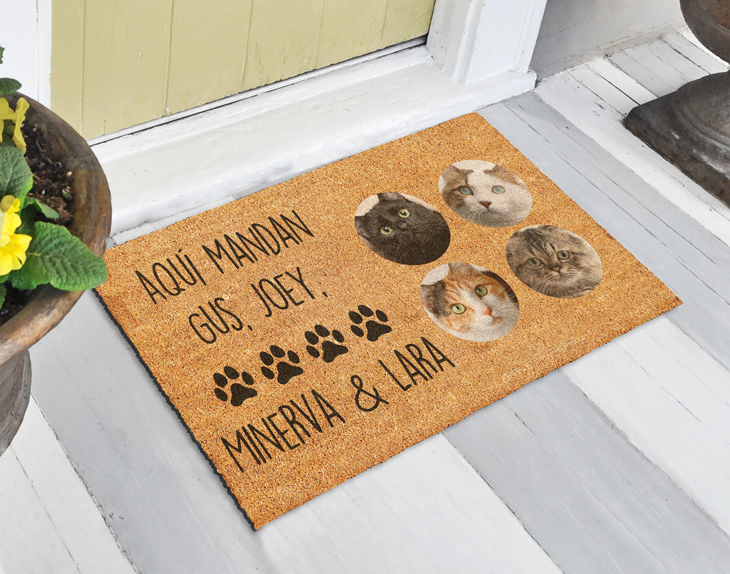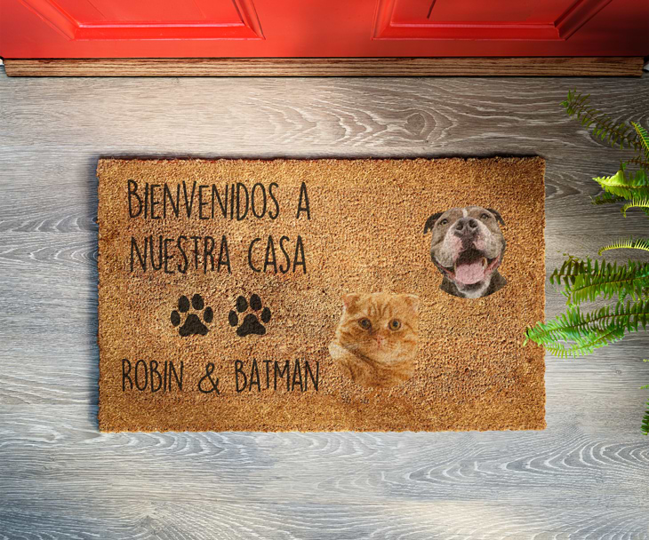 ¿Te gustaría decorar la entrada de tu casa con la imagen de tu mejor amigo peludo? Entonces este felpudo personalizado con foto de mascota es justo lo que necesitas para hacer realidad esa idea tan tierna. Porque nuestras mascotas no solo nos regalan momentos inolvidables, también se ganan un lugar especial en nuestro corazón. Y no hay nada más bonito que llegar a casa y ver, antes de entrar, su carita o caritas, si tienes más de una, dándote la bienvenida. Si lo que quieres es sorprender a alguien especial, este es el regalo para los amantes de los animales. Regálale un felpudo original con la foto de su perro o gato y sácale una sonrisa cada vez que entre en casa. Puedes añadir el nombre de su mascota o incluso una frase divertida. Tenemos cuatro diseños disponibles para que elijas según cuántos animalitos quiera incluir, uno, dos o hasta cuatro. Será un detalle original, cargado de amor y perfecto para darle un toque muy personal a cualquier entrada. Y lo mejor: personalizarlo es facilísimo. Solo tienes que elegir el felpudo que mejor se adapte a su puerta, seleccionar el diseño que más te guste, subir las fotos de esas adorables mascotas y escribir sus nombres o una frase especial. Y listo tendrás un regalo con foto de tu mascota que emocionará a cualquiera. Importante: este felpudo está pensado para uso decorativo y no para zonas de alto tránsito. Si se expone a condiciones climáticas adversas o a un uso intenso, su durabilidad puede reducirse. Importante: está fabricado en fibra de coco natural, por lo que puede presentar ligeras variaciones de color. Los detalles de la imagen pueden no verse con la misma nitidez que en una pantalla retroiluminada, pero el resultado sigue siendo único y encantador.