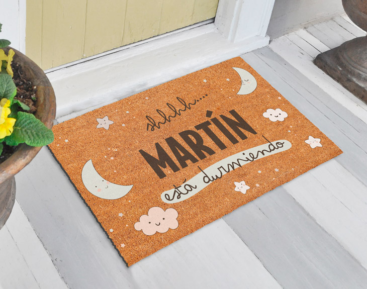 ¡Cuidado! Estás a punto de entrar en una casa habitada por un ser recién llegado a este mundo. Utiliza este felpudo personalizado para avisar a todos tus invitados de que tu bebé está durmiendo, ¡o simplemente para que sepan lo feliz que estás de haber tenido un hijo/a! Personaliza este fantástico felpudo con el nombre de tu niño/a y verás lo bonito que queda entre las nubes, estrellas y lunas. Dale un toque especial a tu entrada con este felpudo de durabilidad aproximada de 1 año. Importante: Son felpudos de fibra de coco natural, por tanto pueden tener variaciones de color. Además, los detalles pueden no ser tan perceptibles como en una pantalla retroiluminada.