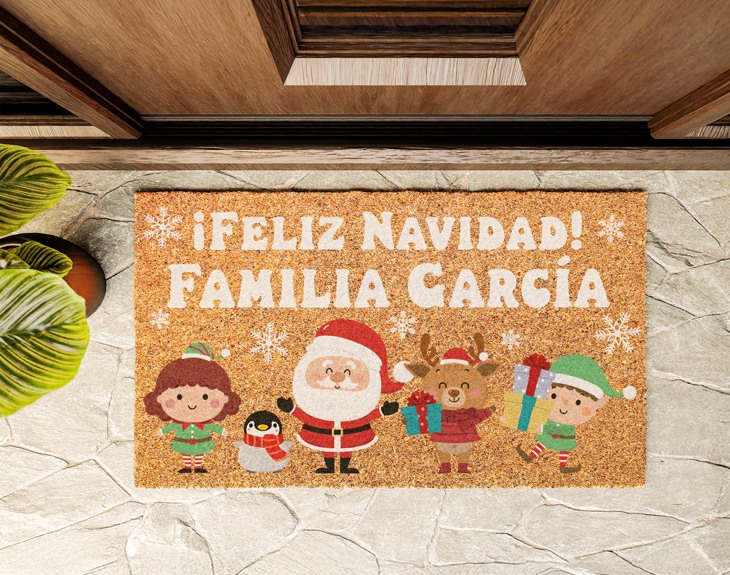 Sin duda, la Navidad es la época más bonita del año. Muchos la esperamos con ilusión, y en cuanto llega, nos entran unas ganas locas de decorar todo. Si eres de los que adoran poner detalles navideños por todas partes, este felpudo personalizado no puede faltar en la entrada de tu casa. Su diseño está lleno de espíritu navideño: con un alegre Santa Claus, un simpático reno, un pingüinito y unos elfitos adorables que lo convierten en un complemento único para dar la bienvenida con color y origunalidad. Es perfecto como regalo de Navidad o, por qué no, como un autoregalo navideño. Porque no hace falta esperar a que te sorprendan, Sorpréndete tú! Disfruta del placer de regalarte algo bonito que, además, quedará genial como parte de tu decoración navideña del hogar. Personalizar tu felpudo de Navidad es facilísimo: elige el tamaño que más te guste, añádelo al carrito y escribe el texto que quieras en el área de diseño. ¡Y listo! Tendrás un felpudo tan especial que todos van a querer uno igual. Importante: este felpudo está pensado para uso decorativo y no para zonas de alto tránsito. Si se expone a condiciones climáticas adversas o a un uso intenso, su durabilidad puede reducirse. Importante: está fabricado en fibra de coco natural, por lo que puede presentar ligeras variaciones de color. Los detalles de la imagen pueden no verse con la misma nitidez que en una pantalla retroiluminada, pero el resultado sigue siendo único y encantador.