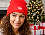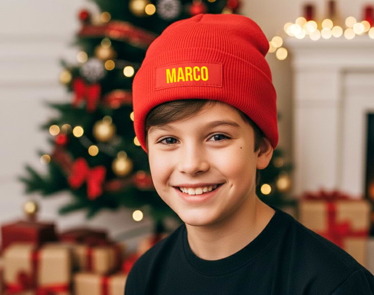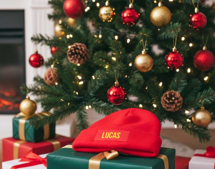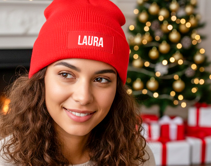 • Gorro de punto con etiqueta personalizado. • Tarjeta recordatoria.