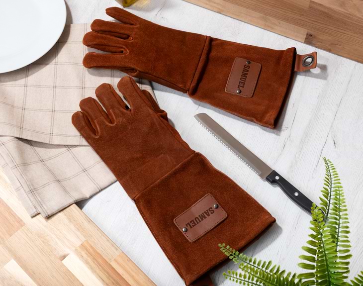 ¿A quién no le puede gustar una buena barbacoa? Todos hemos estado alguna vez en una: el olor de la carne recién hecha, su sabroso sabor en la boca, las risas con nuestros familiares y amigos... ¡Son momentos únicos! Eso sí, hay que tener mucho cuidado con el fuego. Las barbacoas las tiene que hacer una persona con experiencia, que sea sabio en el glorioso arte de cocinar carne. ¡Necesitará todo el material posible! Queremos que tenga toda la seguridad posible. Por ello contamos con estos guantes de cuero personalizados. ¡Son tan elegantes como seguros! Estos preciosos guantes marrones con nombre serán la sensación de esa barbacoa. Están hechos al 100% de cuero, lo que te permitirá cocinar sin ningún tipo de miedo. ¡Y lo podrás personalizar con un nombre! Entra en el diseñador y escribe el nombre del cocinero de la familia. Nosotros nos ocuparemos de grabarlo en el cuero. Material: cuero, piel de búfalo. Dimensiones: 37x21 cm. Interior: franela. Color: marrón. Talla única Importante: el producto que recibas puede ser ligeramente distinto con respecto a las imágenes de la web. El cuero es un material natural, por lo que el aspecto puede variar dependiendo de la unidad.