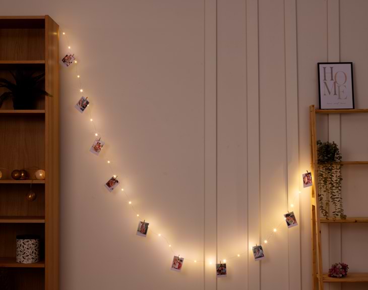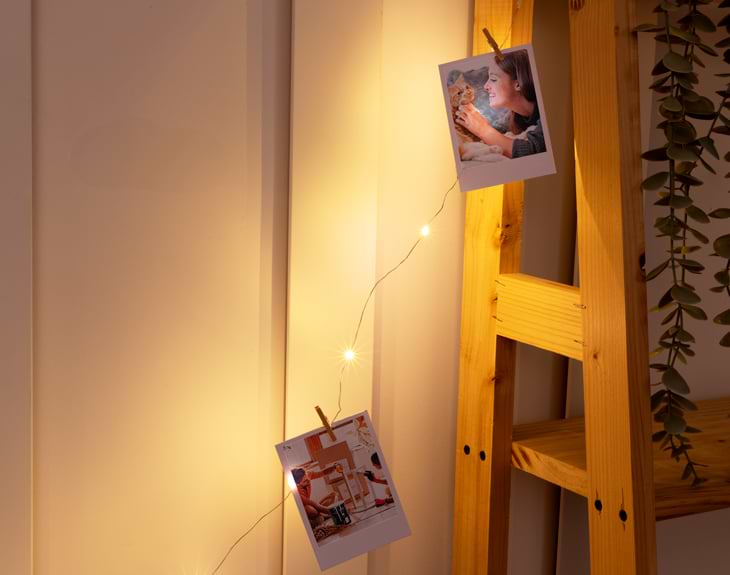 ¿Quieres darle un toque cálido y muy personal a ese rincón especial? Nuestra guirnalda de luces con fotos Polaroid y pinzas decorativas es perfecta para ambientar cualquier espacio con magia, creando un lugar acogedor y emotivo donde revivir tus recuerdos más bonitos con las personas que más quieres. Ideal para decorar tu habitación, el salón, tu boda o para sorprender con un regalo original hecho a medida. Es el detalle perfecto para regalar a un familiar, a tu pareja o a ese amigo/a especial, con las mejores fotos que tengáis juntos. Esta guirnalda de luces LED emite una luz suave y cálida, funciona con dos pilas AA (no necesita enchufe), mide 3 metros e incluye 10 fotos Polaroid personalizadas sujetas con sus 10 pinzas de madera. Todo lo necesario para contar una historia visual: un año de momentos especiales, una relación romántica, una familia unida o esos recuerdos adorables de tus hijos o mascotas. Personalizarla es muy fácil: solo tienes que añadirla al carrito y, en el área de diseño, subir tus 10 fotos favoritas. Y listo tendrás las luces decorativas con fotos más tiernas y acogedoras de todas. Cada elemento de esta guirnalda, está pensado para transmitir calma, alegría y mantener vivos esos recuerdos que iluminan el alma. Detalles de la guirnalda: - Longitud: 3 metros de alambre. - Tipo de luz: LED blanca, tenue y cálida (no parpadea). - Funcionamiento: cajetín para 2 pilas AA (no incluidas). Medidas de las fotos Polaroid: