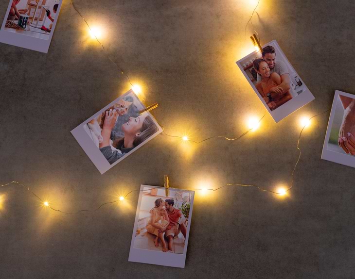 • Guirnalda de luces a pilas. • 10 fotos Polaroid personalizadas. • 10 Pinzas de madera pequeñas. • Tarjeta Recordatoria.
