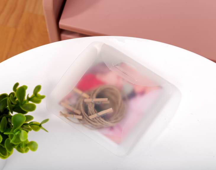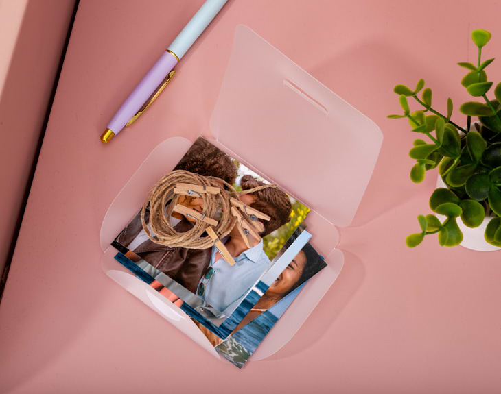 • 5 fotos polaroid personalizadas. • Pinzas de madera. • Hilo yute. • Sobre transparente. • Tarjeta Recordatoria.