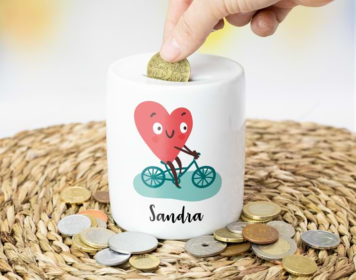 ¿Has encontrado el amor de tu vida? ¿Estás seguro o segura de que va a ser tu compañero o compañera de vida? Es el momento de ahorrar para empezar un futuro juntos. Seguro que ya habéis hablado del piso que queréis comprar, del primer viaje grande e importante que queréis hacer o, incluso, de empezar a pensar en la educación de los futuros hijos. Si es así, esta hucha de cerámica personalizada es perfecta para darle una sorpresa a tu pareja. Solo tendrás que elegir los corazones que más os representen (máximo 8 corazones) y ponerles el nombre que quieras. ¡Será un regalo precioso para empezar a ahorrar por una vida maravillosa juntos! Importante: nuestro equipo de personalización se encargará de ajustar la distribución de los personajes en el producto en función de su tamaño para que se vean lo mejor posible. Importante: la hucha cuenta con una apertura de tapón oculto en la parte baja para extraer el dinero. Altura: 9,5cm.