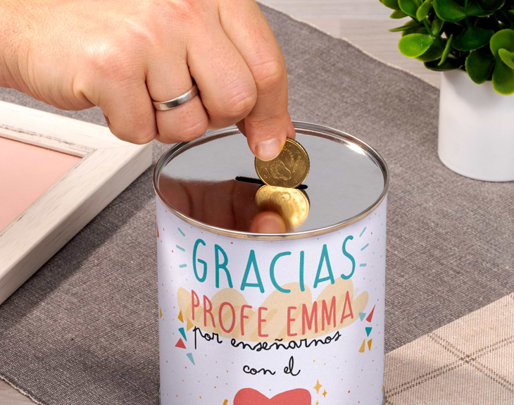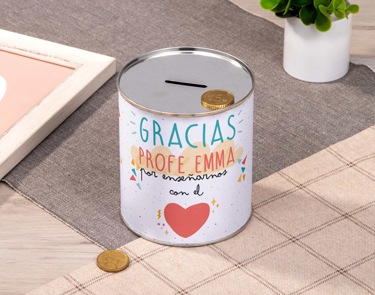 La mejor recompensa que puede recibir un profesor es todo el cariño de sus alumnos. ¡Y unas buenas vacaciones también! ¿No te gustaría ayudarle a ahorrar para ese viaje en sus vacaciones de verano a la vez que se lleva un bonito recuerdo del curso? Emociónale con esta hucha de lata personalizada con nombre. Con ella, podrás darle las gracias por haberos enseñado con tanto amor durante tantos meses. Aunque no puedas darle un detalle de fin de curso muy grande, sí que puedes ayudarle a permitirse todo lo que quiera. Cada vez que vea esta hucha circular se acordará de vosotros y no le costará nada ahorrar. Pero además de ser bonita, ¡será exclusiva para él/ella! Puedes escribir su nombre sobre este regalo original para profesores. Ya sea para ahorrar o como elemento decorativo, esta hucha redonda de metal será la dedicatoria más bonita para tu profesor/a favorito/a. Medidas: -32 cm de circunferencia -10 cm de diámetro -11,5 cm de altura Material: metal Importante: esta hucha no está preparada para abrirse frecuentemente. Una vez abierta no se puede volver a cerrar.