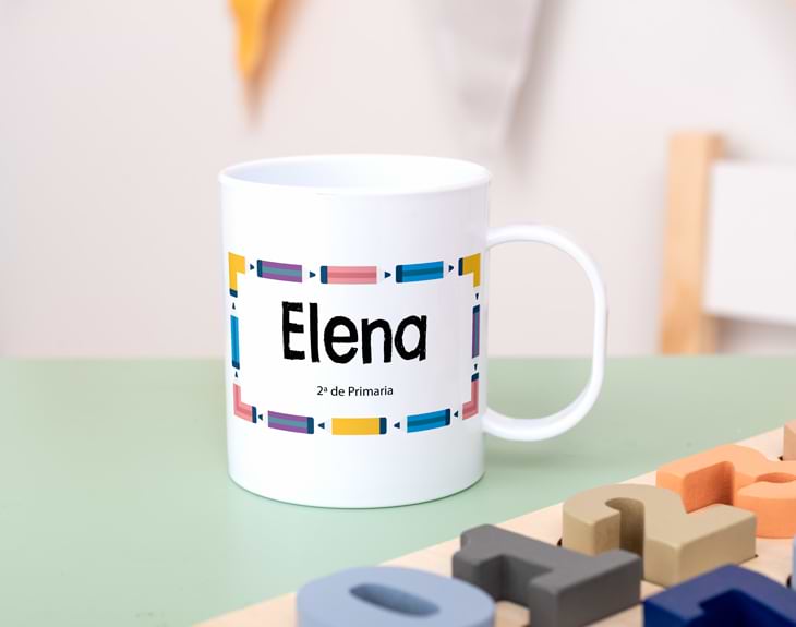 Esta taza de plástico personalizada con diseño "Lápices" es perfecta para el colegio o guardería de tu hijo o hija. Sabemos lo importante que es que cojan la costumbre de beber agua, y una taza original con un diseño tan colorido les puede ser de ayuda. Si tu peque va con ganas al cole, no dudes en regalarle esta taza personalizada con su nombre y un texto inferior (por ejemplo, para especificar el curso que está estudiando). Un detalle que le va a encantar y lo va a enseñar a todos sus compañeros. Personalizarla es súper fácil: añade el producto al carrito y entra al área de personalización. Allí en nuestro diseñador podrás completar el diseño con el texto que quieras. ¡Y listo! En pocos pasos tendrás esta preciosa taza de plástico, que se convertirá en un regalo original para la vuelta al cole. Importante: El plástico de la taza no contiene BPA. Esta taza es apta para lavavajillas y microondas.
