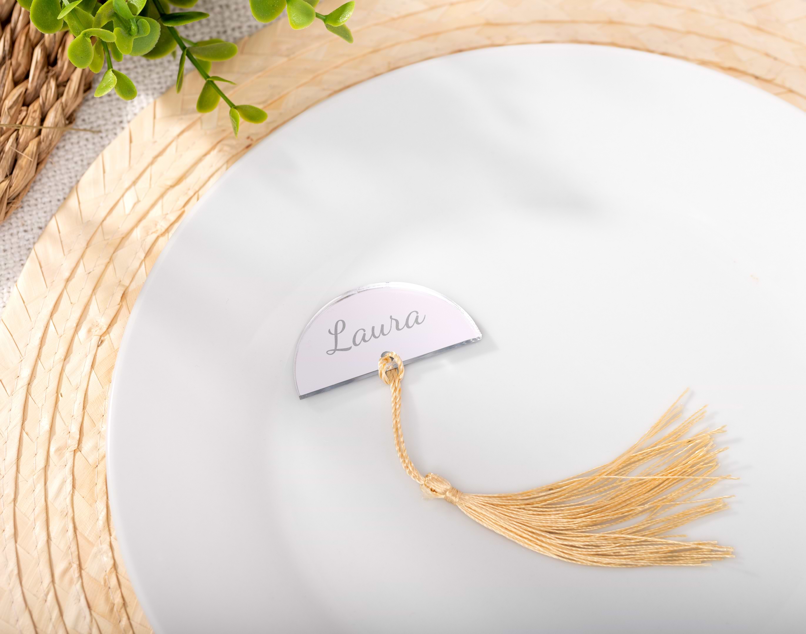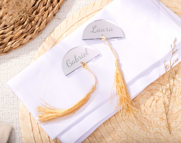 Es posible que, mientras organizas tu boda, pequeños detalles se te pasen por alto. ¿Has pensando en cómo identificar los sitios para los invitados en las mesas? ¡Tenemos la solución perfecta que te encantará! Nuestros identificadores de espejo personalizados con diseño "Abanico" son la mejor opción para darle un toque único y elegante a las mesas de tu boda. Así, todos los invitados sabrán rápidamente dónde se deben sentar. ¡Quedarán preciosos! Estos originales identificadores no sólo te ayudarán a organizar las mesas de manera práctica, sino que, además, se convertirán en un hermoso recuerdo de ese día tan especial. Podrás elegir la cantidad que necesites y personalizarlos a tu gusto. El texto va grabado, lo que les da un acabo delicado, y vienen acompañados de un pequeño pompón dorado que les aporta un toque elegante. Para personalizar estos identificadores es muy sencillo. Añade las unidades que desees al carrito y entra al área de personalización. Allí puedes escribir el nombre que quieras, podrán ser todos iguales o distintos ¡a tu gusto! Medidas: 3 x 6 cm.