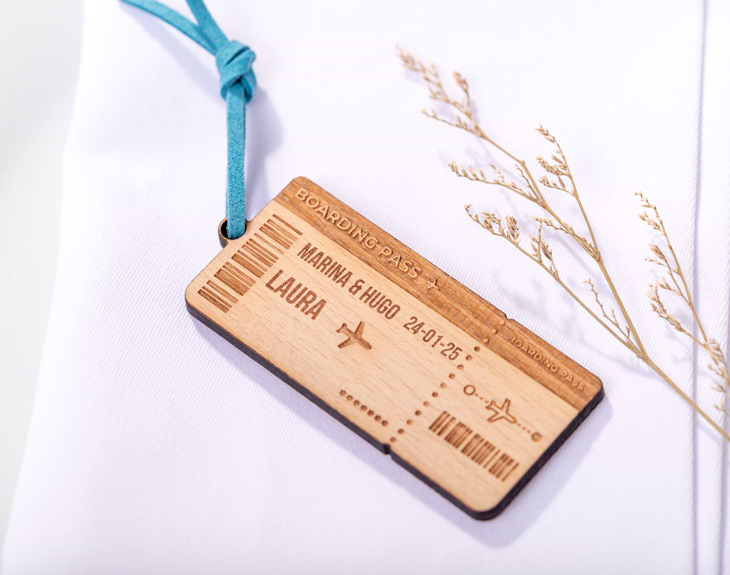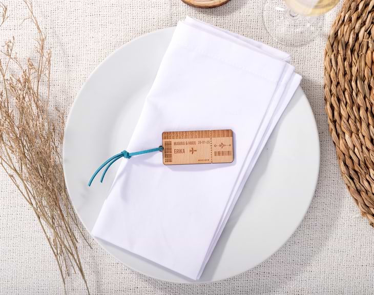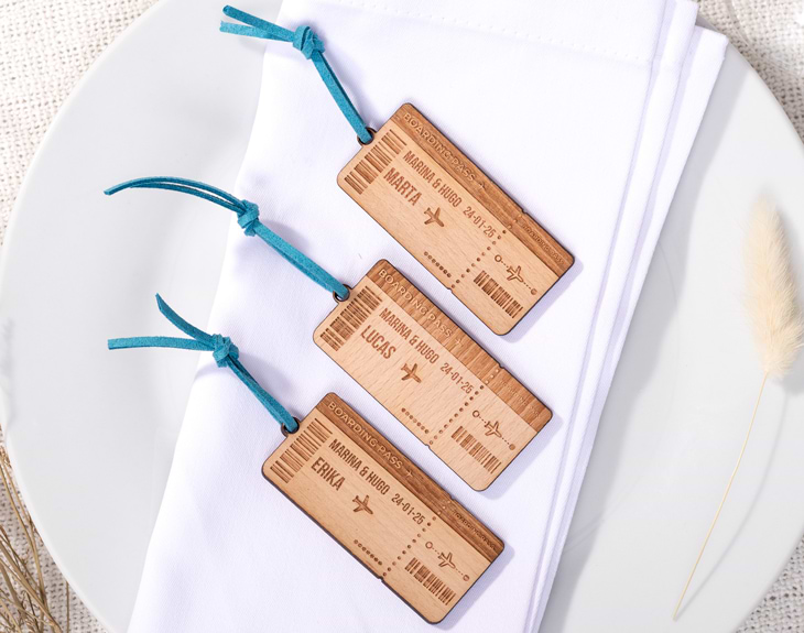 Si el día de tu boda quieres sorprender a todos los invitados, tenemos el detalle perfecto. Se trata de nuestro identificador de mesa de madera personalizado con diseño "Billete de avión". Un detalle original y divertido que quedará genial si los novios son unos viajeros aventureros. Este identificador es una forma original de organizar las mesas de tu boda. Lo mejor de este identificador de madera es que es personalizable: podrás poner la fecha de la boda, junto con los nombre de los novios y los invitados. Imagina la sorpresa en la cara de los invitados cuando lleguen a su sitio y descubran su nombre en el identificador, ¡será un detalle que no olvidarán! Personalizar este identificador de madera es muy sencillo. El primer paso a seguir consiste en añadir el producto al carrito y entrar al área de personalización. Una vez ahí, ya puedes la fecha de este día tan especial junto con los nombre los protagonistas y también de los invitados. ¡Pronto estará perfecto y listo para decorar las mesas! ¡Será un original regalo para bodas! Medidas: alto 3,5cm - ancho 8cm