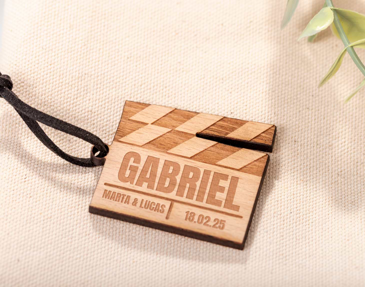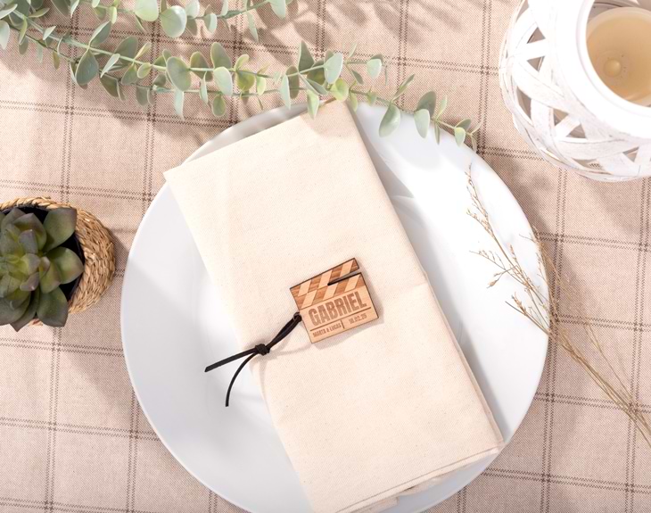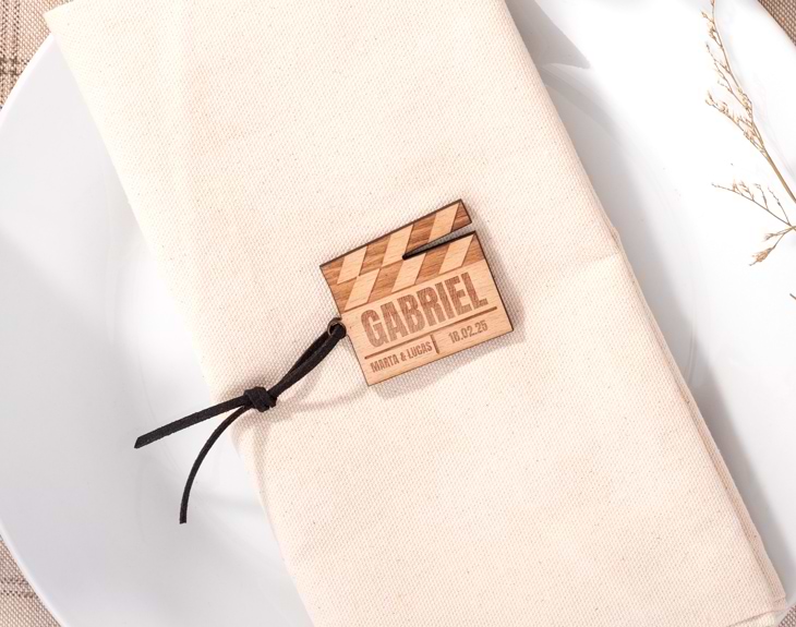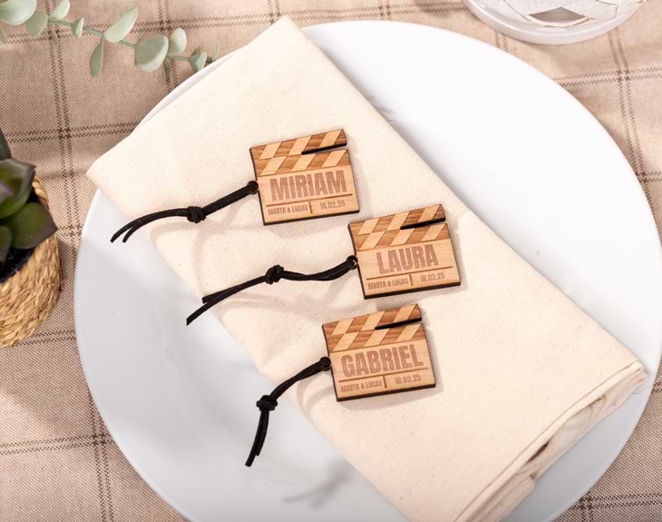 Sabemos que quieres que tu boda sea como la de una película, que todo salga perfecto y sea un día inolvidable. Para lograrlo, la organización es lo más importante, y por ello te traemos una solución divertida y original para que tus invitados sepan dónde sentarse durante el banquete. Nuestros identificadores de madera personalizados con diseño "Claqueta" son perfectos para que todos tus invitados encuentren su sitio. Con estos originales identificadores de mesa, la organización de los asientos en tu boda estará resuelta. Lo mejor es que podrás elegir cuántas unidades quieres y personalizarlas todas igual o cada una con un texto diferente. Podrás incluir los nombres de los invitados, la fecha de la boda y el nombre de los novios. Los identificadores están hechos de madera y con una cuerda ante que podrás elegir el color. ¡El texto va grabado! Si te han gustado los identificadores tanto como a nosotros, añade al carrito la cantidad de productos que desees. Luego, ingresa a nuestros diseñador para personalizar estos identificadores y añade el texto que quieras a cada uno de ellos. Nosotros nos encargamos que queden perfectos. Tu boda tendrá un detalle original que hará inolvidable este día para los novios y los invitados. Medidas: 4,11 x 5,05 cm.