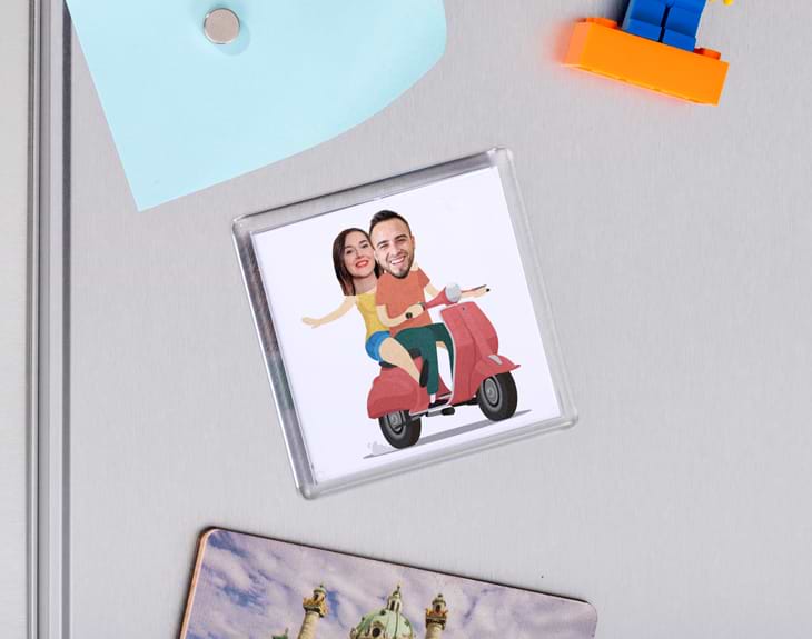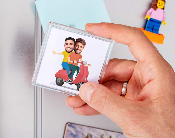¿Te encantan los viajes en moto y sentir la brisa fresca en la cara? Si tú y tu pareja sois amantes de este tipo de aventuras, tenemos una idea divertida para revivir esos momentos: un imán personalizado con vuestras imágenes montados en una de esas vespas tan bonitas. Te aseguramos que os traerá un montón de recuerdos inolvidables. Este imán cuadrado de metacrilato hará que vuestras caras destaquen en la nevera, y lo mejor es que podréis revivir esa chispa especial de cada viaje cada vez que lo veáis. Una forma nueva y original de sonreír cada día. Además, es perfecto como detalle romántico o como regalo de aniversario, San Valentín o para bodas. También es ideal para sorprender a una pareja amiga. Seguro que les encantará y se convertirán en fans de este recuerdo tan personal. También puedes usar este imán con caras de fotos para decorar cualquier superficie metálica con un toque divertido y sentimental. Ideal como regalo único, lleno de personalidad y con un estilo muy especial. Personalizarlo es muy fácil: simplemente escoge qué tipo de pareja sois, selecciona esa foto en la que salís perfectos y súbela a nuestro diseñador online. Al editar la imagen, podrás recortar vuestras caras y ajustarlas a la plantilla del cuerpo prediseñado. Nosotros nos encargaremos de que queden impecables y espectaculares. Medidas: 6x6x0,4cm.