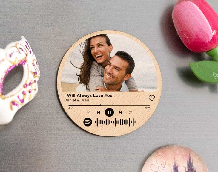 ¿Te has olvidado de la cita médica que tenías hace unos días? ¿Quieres tener a la vista la lista de la compra para que no se te olvide nada? ¡Puedes hacerlo de la forma más original con este imán resistente para la nevera personalizado para tu nevera o la de quien tú quieras! Una vez que agregues este regalo romántico original al carrito, te va a aparecer la opción de personalizarlo, entrando en nuestro diseñador podrás poner la imagen a tu elección así como el texto superior e inferior ¡Todo a tu gusto! Por último, en el buscador de Spotify añades el título de la canción para que se pueda reproducir con el código que irá en la parte inferior. Material: madera. Medidas: 6 centímetros de diámetro. Importante: Las maderas tienen vetas y estas quedan reflejadas en la imagen. ¿Cómo se personalizan los productos Spotify? A la hora de personalizar tus productos relacionados con Spotify, tendrás que contestar a una serie de preguntas. De esta manera… ¡tendrás un regalo original de lo más musical! Cuando llegues al diseñador te encontrarás con la plantilla del producto, con tres apartados a personalizar (texto, foto y código Spotify). Para personalizar cada uno sólo tendrás que hacer click encima de cada cuadrado de personalización. Una vez dado, solo tendrás que escribir el texto y subir la fotografía a nuestro servidor. ¡Podrás modificar el color del texto o su lugar en el diseño! En el momento de añadir esa canción tan característica, no tendrás ningún problema. Escribe la canción o el artista que quieras en el buscador del código Spotify, y a partir de ahí aparecerán una serie de resultados. Solo tendrás que pinchar sobre la canción... ¡no tendrás que hacer nada más! Dependiendo del producto, podrás modificar las características del código: color, fondo o lugar. ¿Cómo se escanea el código? Para poder descubrir de qué canción se trata tendrás que abrir la aplicación de Spotify en tu teléfono móvil y darle al apartado "Buscar". En la parte superior encontrarás un buscador, cuando pulses sobre él verás que en la esquina derecha aparece un icono de una cámara. Al pinchar te abrirá la cámara, únicamente tienes que apuntar al código y automáticamente se reproducirá tu canción. Importante: Este producto es una réplica del diseño de reproducción de Spotify, pero NO es un altavoz.