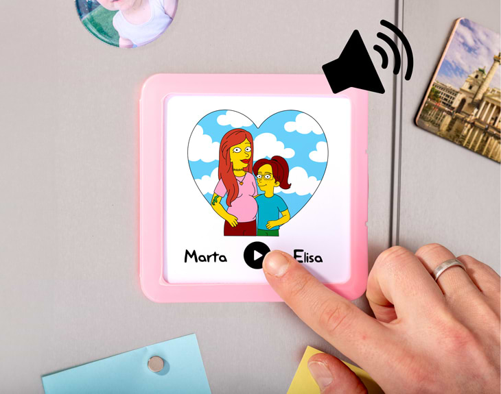 Seguro que mamá y tú alguna vez os habéis imaginado cómo sería convertiros en personajes de vuestra serie favorita: Los Simpson. Pues con este imán musical personalizado podrás hacer este sueño realidad y también sorprender a mamá en cualquier ocasión. Y es que este imán de colores es un detalle de lo más divertido que dejará sin palabras a mamá. Aunque sabemos que mola mucho convertirse en un habitante de Springfield, este oriinal imán no es como el resto. Sirve para colocarlo en la nevera pero es que además incluye un reproductor de música que se activa pulsando el play que verás en el diseño. Podrás añadir desde vuestra canción favorita hasta un mensaje que no quieras que olvide nunca. ¡Y podrá reproducirlo siempre que quiera! Para personalizar este imán de colores, lo primero es acceder al área de personalización. Una vez dentro, podrás comenzar a crear tus personajes desde cero y con todos los detalles necesarios para que sean igualitos que mamá y tú. Completa el diseño con vuestros nombres y añade el audio que quieras. ¡Será el regalo perfecto para el Día de la Madre! Medidas del imán: 11 x 11 cm. Colores disponibles: rojo, rosa, amarillo, blanco y azul. Importante: Estos imanes musicales son recargables. Su batería, situada en la parte trasera, te permite conectar un cable USB de tipo C.