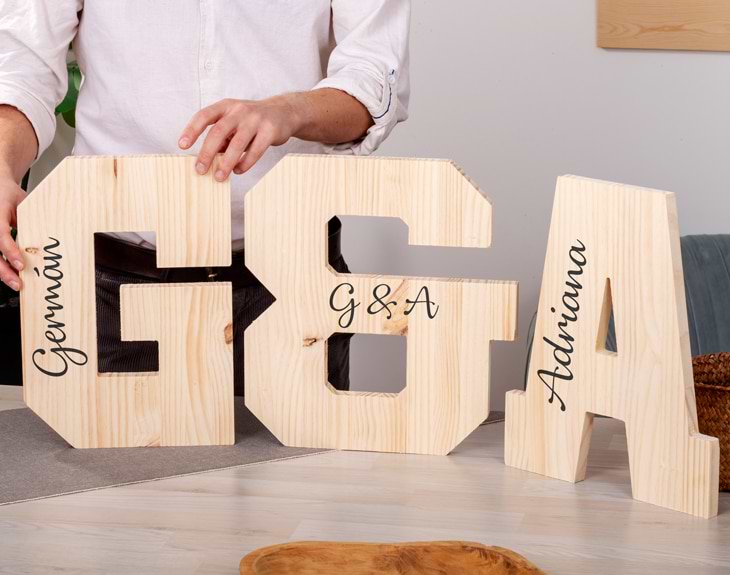 ¿No sabes cómo darle un toque único a ese evento que se celebra pronto? Una boda, un cumpleaños, una comunión, un aniversario... No importa la ocasión, solo necesitas estas letras de madera personalizadas para decorar la estancia y dejar a todo el mundo sin palabras. ¡Son perfectas! Ya sea para decorar en el día de tu boda, para ese rinconcito de casa que está un poco vacío o para formar el nombre del cumpleañero/a. Estas originales iniciales son todo lo que necesitas para que cualquier evento o rincón sea único. Podrás elegir qué letras quieres y también cómo quieres personalizarlas, con imágenes o con texto. Llega la hora de personalizar tus letras y no te preocupes porque es muy sencillo. En primer lugar vas a poder escoger cuántas letras quieres gracias a nuestro selector de cantidad. Después, añádelas al carrito y entra en el área de personalización. Desde ahí, elige la inicial y cómo la vas a personalizar, del resto nos encargamos nosotros. ¡Será el detalle perfecto para cualquier momento! Medias aproximadas: - 35 centímetros de alto. - El ancho depende de la letra escogida.