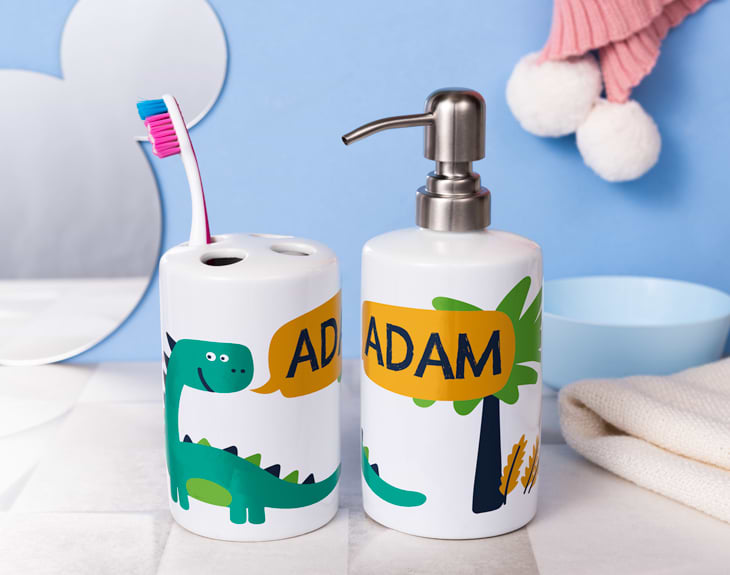 ¡Embárcate en una emocionante aventura prehistórica con nuestro adorable set de jabonera y portacepillos personalizados con el diseño de un dinosaurio! Es una decoración ideal para el baño del más pequeño de la casa, le dará un toque más personalizado y original. Ya que la higiene es muy importante en el día a día, este set de jabonera y portacepillos es perfecto para llevarlo a cabo. Aunque es un pequeño detalle, puede hacer que a tu hijo no se le olvide lavarse las manos antes de comer y los dientes después. Le hará disfrutar de la magia de los dinosaurios en su rutina diaria y agrega un toque de diversión y estilo al cuarto de baño. Ambos diseños están fabricados de cerámica y tienen el mismo tamaño . Cada superficie tiene el dibujo de un dinosaurio y se pueden personalizar por separado, tienes la opción de poner el mismo nombre o dos diferentes. Material: cerámica. Altura del portacepillos: 11,5 cm. Altura de la jabonera: 18 cm. Diámetro: 7 cm.