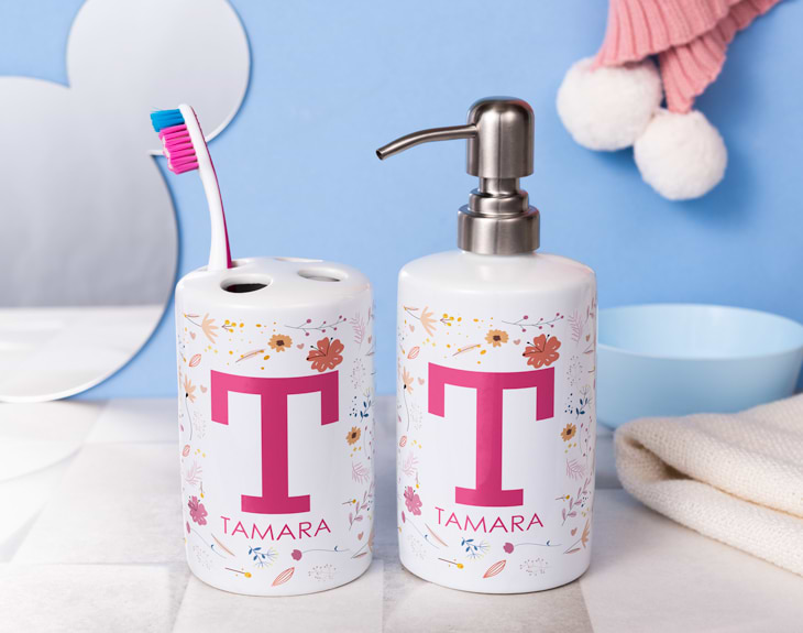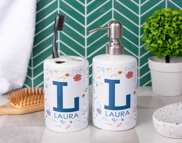 Si tu casa está llena de flores, significa que eres un verdadero amante de la naturaleza. Y como sabemos que cada estancia importa, queremos que la decoración del baño también tenga esta preciosa temática. Por eso, necesitas darle un toque único con nuestro set de jabonera y portacepillos personalizados. Su diseño te robará el corazón porque es tan elegante y bonito que quedará genial en cualquier cuarto de baño. Hazte con este original set para el baño y haz que esta estancia de la casa se vea con un toque muy diferente. Esta jabonera y portacepillos te alegrarán todas las mañanas y serán los recipientes perfectos para tener bien organizado el jabón de mano y tus cepillos de dientes. Quedarán ideales en tu baño, tanto si vives solo como si lo haces en pareja. ¡Es un regalazo! Si quieres saber cómo personalizar este set de jabonera y portacepillos, sigue leyendo porque es muy sencillo. Añade el producto al carrito y entra en el área de personalización. Ahí, tendrás la opción de personalizar la jabonera y el portacepillos por separado. Podrás poner el mismo diseño en ambos o uno diferente en cada uno. Primero elige el color del diseño (rosa o azul) y después escribe la inicial y nombre que quieras. Así de fácil. ¡Tu baño tendrá una decoración única! Importante: podrás ajustar el tamaño de tu inicial en el interior del diseñador. Solo tendrás que escribir la letra que quieras, clicar sobre ella y utilizar los puntos en las esquinas de la inicial para aumentarla o disminuirla. ¡Así podrás poner el tamaño que mejor se ajuste a tu propio diseño de flores silvestres! Material: cerámica. Altura del portacepillos: 11,5 cm. Altura de la jabonera: 18 cm. Diámetro: 7 cm.
