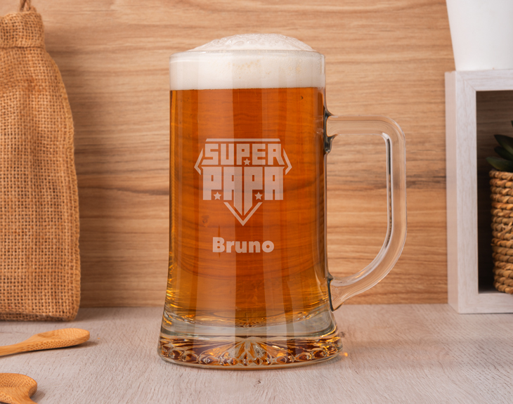 Si os encanta ir a tomar cañas en familia, esta jarra de cerveza personalizada es el detalle perfecto para dejar a papá sin palabras. ¡Así podrá disfrutar de sus cervezas en su propia jarra! Con un diseño "Logo Superpapá", estarás haciendo oficial su título de superhéroe. Brindar en su cumpleaños o en el Día del Padre con este regalo tan original le dará un toque personal único.