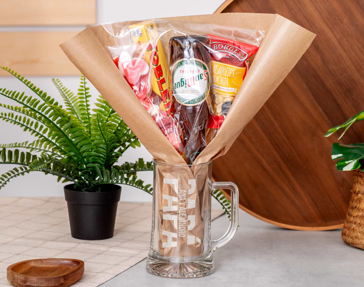 Si tu papá es un auténtico amante de la cerveza y el picoteo, tenemos el regalo perfecto para él: ¡un ramo de snacks con jarra de cerveza personalizada! Es ideal para que disfrute de un rato de relax con su bebida favorita y unos deliciosos snacks, tanto dulces como salados. ¡Este ramo lo tiene todo!