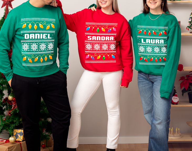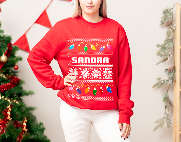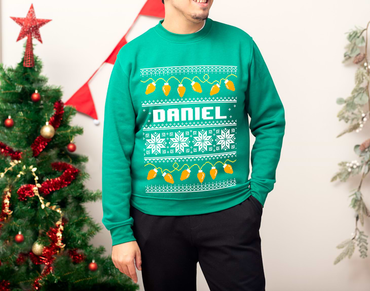 ¿No te mueres de ganas de decorar tu casa con adornos navideños? Las guirnaldas, las estrellas, las luces multicolor... Por todos lados tiene que respirarse el espíritu navideño, ¡incluso desde tu ropa! Vístete con los mejores motivos de decoración invernal sobre este sudadera navideña personalizada con nombre. ¿Por qué limitar estos adornos a tu salón cuando puedes llevarlos puestos al trabajo o de fiesta? Ya sea como ropa de fiesta navideña o sudadera para la cena de Nochebuena, con tan solo unos clics puedes tener tu regalo original para Navidad o el amigo invisible. Añade el producto al carrito y personaliza a tu gusto este diseño navideño con tu nombre. ¡Mira qué bonito quedará en el dibujo de copos de nieve y luces navideñas! Puedes personalizar a tu gusto tanto el diseño como la propio sudadera. ¡Disponible en dos colores y varias tallas! Tanto para adultos como tamaños infantiles, para que toda la familia tenga su atuendo de Navidad a juego con los colores verde o rojo. Material: 50% algodón, 50% poliéster. Material elástico, fino y suave por fuera, levemente acolchado por dentro.