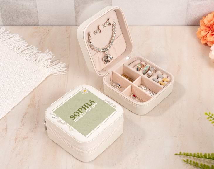 • Joyero portátil pequeño personalizado. • Tarjeta Recordatoria.