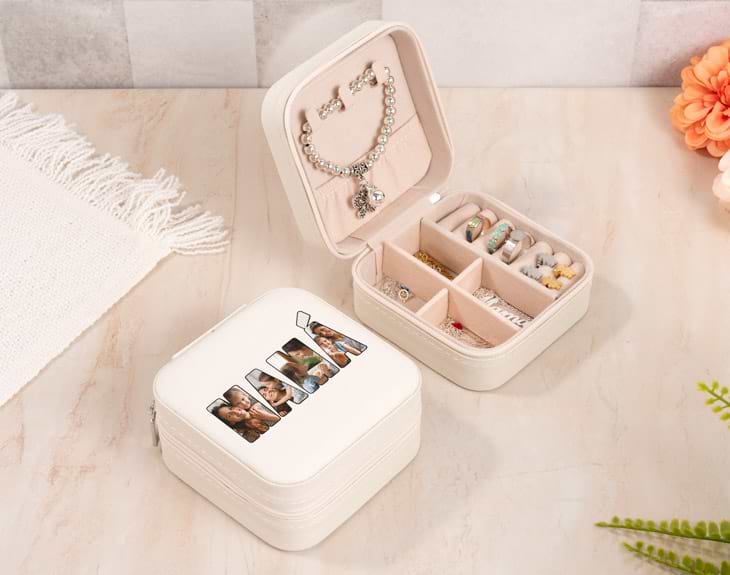 ¡Las madres son la alegría de nuestra vida! Es difícil pensar cómo sería la vida sin una madre, porque están ahí para todo, pase lo que pase. Si tu madre es la persona más importante de tu vida y te apetece hacerle un regalo fuera de lo común, con este joyero portátil personalizado acertarás seguro. Hecho especialmente para todas las mamis, les encantará poder tener un lugar donde dejar todas sus joyitas, y que mejor que este precioso y práctico joyero con un diseño muy especial. Si se acerca el cumple de mamá o el Día de la Madre, sorpréndela con un regalo único como este original joyero. Tiene el tamaño perfecto para que mamá pueda usarlo como quiera: en casa, en la maleta cuando se vaya de viaje o su bolso de todos los días porque cabe en cualquier lado. Es de color blanco, está fabricado con piel sintética y cuenta con varios compartimentos y soportes para guardar todo tipo de joyas. ¡Es el regalo perfecto! Pero para sorprender a tu madre del todo, no te olvides de personalizar este joyero. Añade el producto al carrito y crea tu propio diseño con la plantilla que te dejamos. Primero podrás elegir el color del borde de la palabra "MAMÁ" y después añadir una foto en cada letra. Colócalas como quieras y ya estará listo este regalazo para recibirlo y entregarlo a mamá. Medidas del joyero: 10 x 10 x 5 centímetros. Material: Piel sintética.