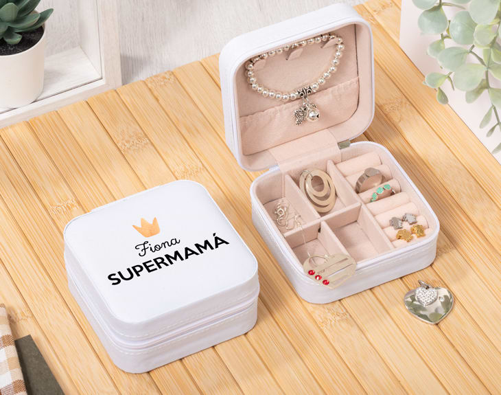 Si quieres hacerle el regalo más original y práctico a tu mamá, tenemos la mejor opción. Se trata de nuestro joyero personalizado con diseño "Supermamá". Es ideal para sorprenderla por el Día de la Madre, por su cumpleaños o simplemente por ser toda una Supermamá. Es una forma de demostrarle lo mucho que la quieres y la aprecias. ¡Le encantará! Dentro de este joyero portátil podrá guardar anillos, collares, pendientes y todo lo que quiera. Tiene varios compartimentos para cada tipo de joya y además, todo irá muy bien protegido y cerrado gracias a su cremallera. Y lo más especial es que es personalizable. ¡Podrás escribir el nombre que tú quieras. ¡Quedará genial! Por último, personalizar este joyero es muy sencillo. El primer paso a seguir consiste en añadir el producto al carrito y entrar al área de personalización. Una vez ahí, ya puedes escribir los nombres que tú quieras. Pronto estará perfecto y listo para regalar. ¡Será un original regalo para madres! Medidas del joyero: 10 x 10 x 5 centímetros. Material: Piel sintética.