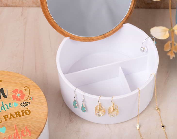 • Joyero redondo personalizado blanco. • Tarjeta recordatoria.