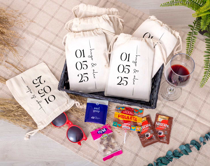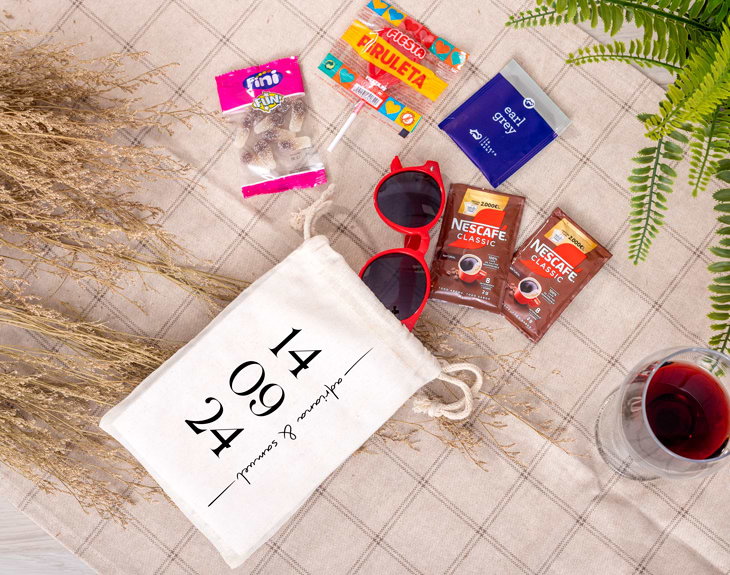 • Bolsa de tela personalizada. • Gafas de sol. • 1 sobre de té. • 2 sobres de café. • Una bolsita de chuches Fini. • Una piruleta. • Tarjeta Recordatoria.