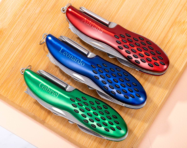 • Navaja multiusos grabada. • Bolsa de tela personalizada. • Llavero de madera grabado. • Tarjeta Recordatoria.